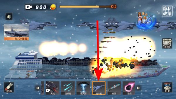 2、也能選擇戰(zhàn)斗機(jī)武器,點(diǎn)擊使用后,戰(zhàn)斗機(jī)將對目標(biāo)戰(zhàn)艦發(fā)起攻擊,帶來可觀的打擊效果,助力削弱敵方戰(zhàn)艦。