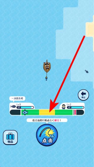 2、當(dāng)漁具出現(xiàn)提示時(shí),在適當(dāng)?shù)臅r(shí)機(jī)點(diǎn)擊停止按鈕,與魚兒進(jìn)行互動(dòng),爭取成功釣到生物,獲得相應(yīng)的游戲反饋。