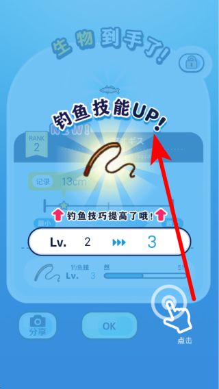 4、成功釣到生物后,會(huì)顯示釣魚技能提升的提示,隨著技能等級提高,后續(xù)釣魚會(huì)更順利,能釣到更多種類的生物。