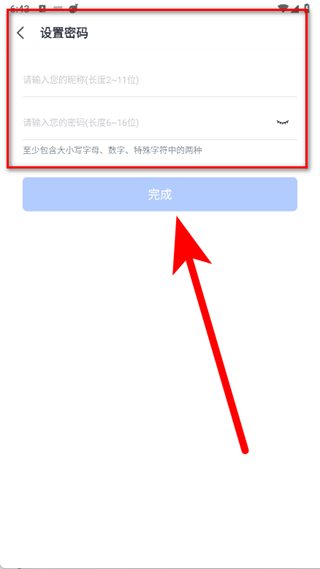 5、進入設(shè)置密碼頁面,按要求輸入昵稱和密碼,點擊完成,完成注冊。