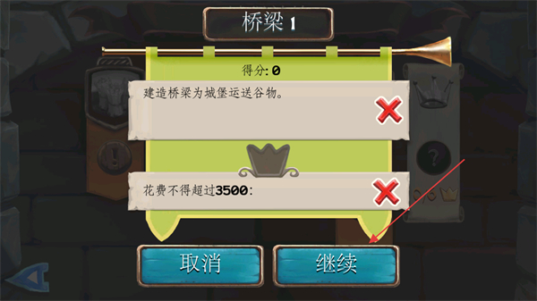1、開(kāi)始游戲后,閱讀關(guān)卡任務(wù)說(shuō)明,如建造橋梁為城堡運(yùn)送谷物,并留意花費(fèi)限制,確認(rèn)后點(diǎn)擊繼續(xù)。