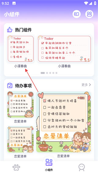 2、在小組件頁面,點(diǎn)擊小漫春曲組件,進(jìn)入其設(shè)置頁面。