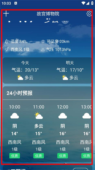 4、在地點(diǎn)天氣頁(yè)面,可查看該地點(diǎn)的濕度、能見(jiàn)度、氣溫等天氣信息。