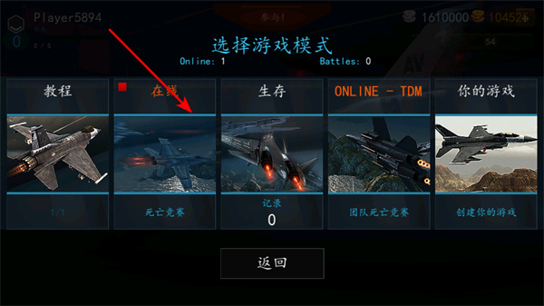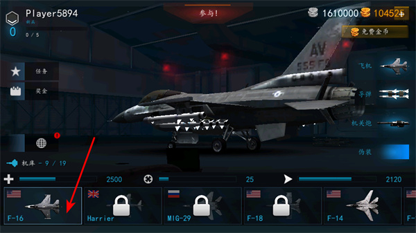 1、選擇戰(zhàn)機,在機庫的界面中,點擊進行選擇F-16等適用戰(zhàn)機,為戰(zhàn)斗做好裝備準備。