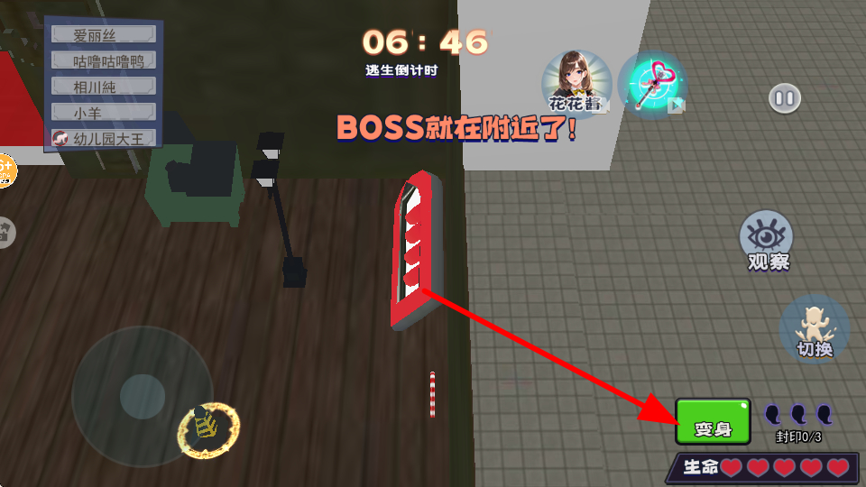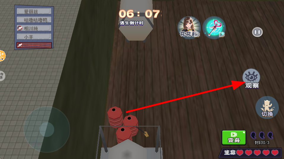 3、切換變身形態(tài),玩家根據(jù)當(dāng)前場(chǎng)景和躲避需求,適當(dāng)?shù)那袚Q變身形態(tài),提升躲避的隱蔽性來(lái)躲避追擊。