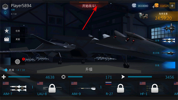 1、開始戰(zhàn)斗,點(diǎn)擊開始戰(zhàn)斗的按鈕,進(jìn)入戰(zhàn)機(jī)戰(zhàn)斗的場景,開啟了游戲的進(jìn)程。