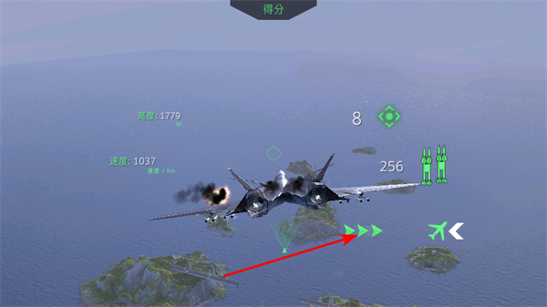 3、飛行進(jìn)行控制,通過右側(cè)的飛行控制圖標(biāo)調(diào)整戰(zhàn)機(jī)飛行狀態(tài),同時(shí)注意戰(zhàn)機(jī)的速度穩(wěn)定性。