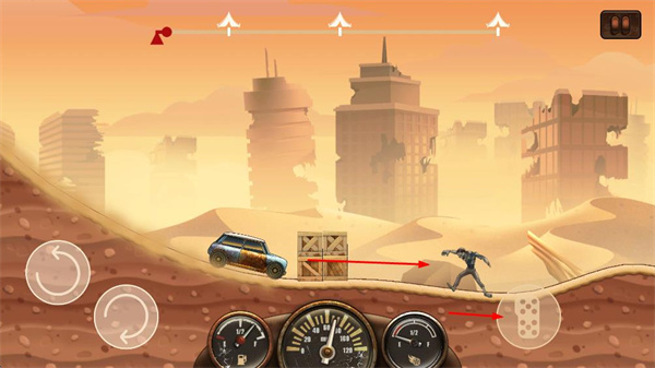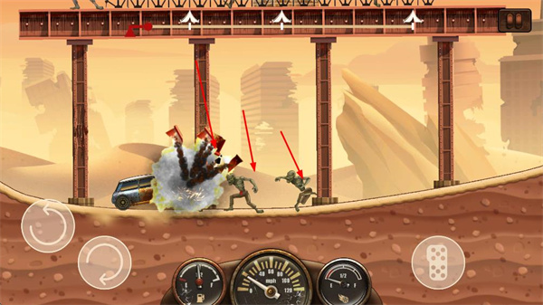 1、玩家操控車輛在末日風(fēng)格的沙漠城市地形中行駛,道路上會遇到敵人和障礙物。