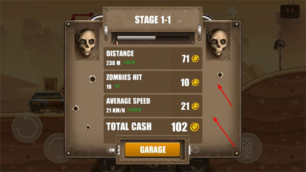 3、每完成一個階段,會顯示行駛距離、擊中僵尸數(shù)量、平均速度和總現(xiàn)金等數(shù)據(jù),根據(jù)表現(xiàn)獲得相應(yīng)的金幣獎勵。