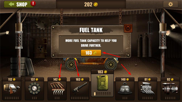 4、玩家可以使用獲得的金幣升級車輛部件,例如升級油箱,增加油箱容量,讓車輛能行駛更遠(yuǎn)的距離,也可升級其他武器、裝備等。