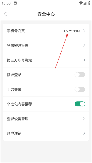 3、在安全中心頁面,點擊手機號變更,進(jìn)入更換手機號頁面。