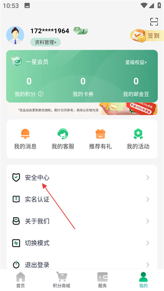 2、在個人頁面,點(diǎn)擊安全中心,進(jìn)入安全中心頁面。