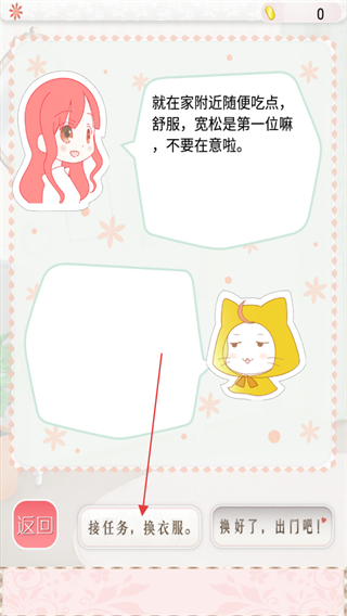 1、閱讀對話文本,了解在家附近就餐及穿著要舒適寬松的建議后,點(diǎn)擊接任務(wù),換衣服按鈕。