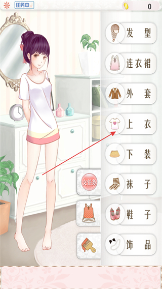 3、點(diǎn)擊右側(cè)服裝分類欄中的上衣,挑選喜歡的上衣為角色搭配。
