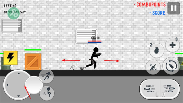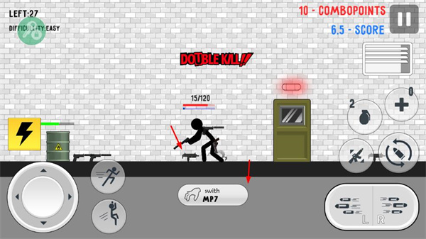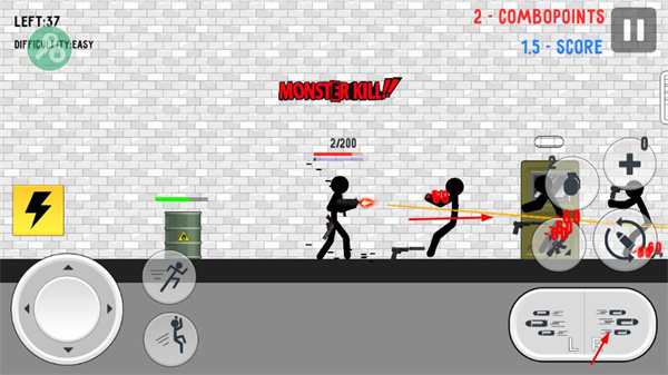 1、玩家操控火柴人角色在場景中移動,場景中有磚墻、木箱、油桶等元素。角色可使用武器射擊敵人,右側(cè)有射擊、投擲等操作按鈕。