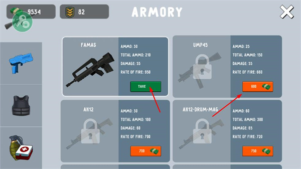 3、在軍械庫界面,玩家可以選擇不同的武器,如FAMAS、UMP45等,部分武器可直接獲取部分武器需要消耗資源解鎖,不同武器有不同的彈夾容量等屬性。