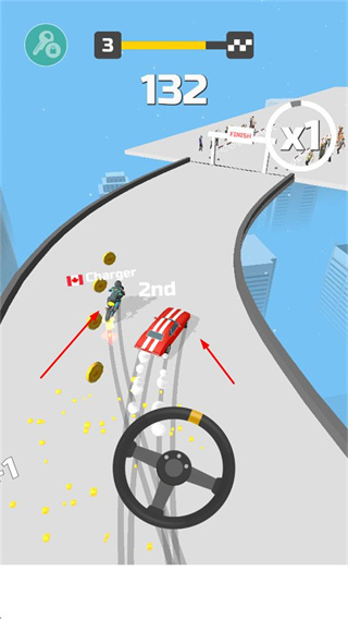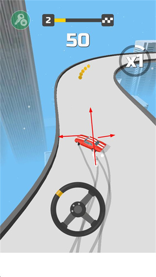 1、玩家操控賽車在高空賽道上行駛,通過下方的方向盤來控制賽車的方向,躲避賽道邊緣,同時(shí)盡可能收集賽道上的金幣。