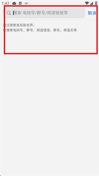 4、在搜索頁面,可輸入電鴿號、群號、頻道鏈接等進行搜索。