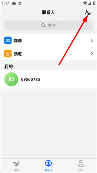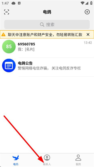 1、在電鴿主界面,點擊底部的聯(lián)系人,進入聯(lián)系人頁面。