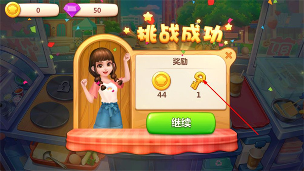 3、完成關(guān)卡挑戰(zhàn)后,并獲得獎(jiǎng)勵(lì),包括金幣和鑰匙等道具,點(diǎn)擊繼續(xù)可進(jìn)入后續(xù)游戲內(nèi)容。