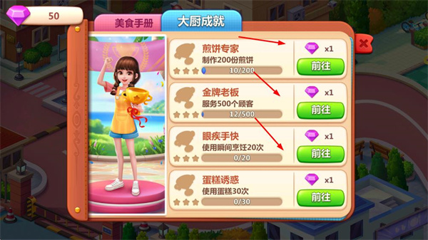 4、設(shè)置了多種成就任務(wù),如煎餅專家、金牌老板、眼疾手快、蛋糕誘等,完成成就可獲得鉆石等獎(jiǎng)勵(lì)。