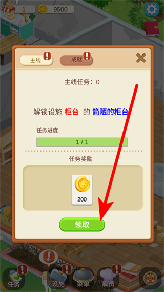 1、先關(guān)注任務(wù)界面,主線任務(wù)會(huì)指引解鎖關(guān)鍵設(shè)施,像解鎖簡陋的柜臺(tái)這類任務(wù),完成后點(diǎn)擊領(lǐng)取,能獲得金幣獎(jiǎng)勵(lì),助力餐廳建設(shè)。