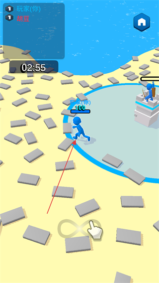 1、進(jìn)入游戲,操控藍(lán)色小人在沙灘場(chǎng)景中移動(dòng),點(diǎn)擊磚塊進(jìn)行搬運(yùn),留意上方剩余時(shí)間02:55。