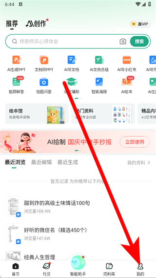 1、打開百度文庫APP,點擊底部導(dǎo)航欄的我的。