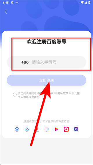 4、在歡迎注冊百度賬號頁面,輸入手機號碼,點擊立即注冊。