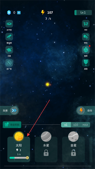 4、進入新界面后,點擊太陽圖標,消耗電量開始創(chuàng)建星球,逐步解鎖其他星球如水星、金星。