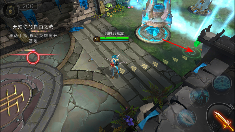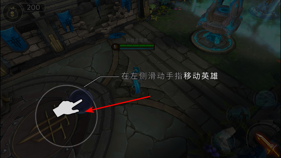 1、移動英雄,在左側(cè)滑動手指,操控英雄在場景中移動,探索地圖并接近戰(zhàn)斗的區(qū)域。
