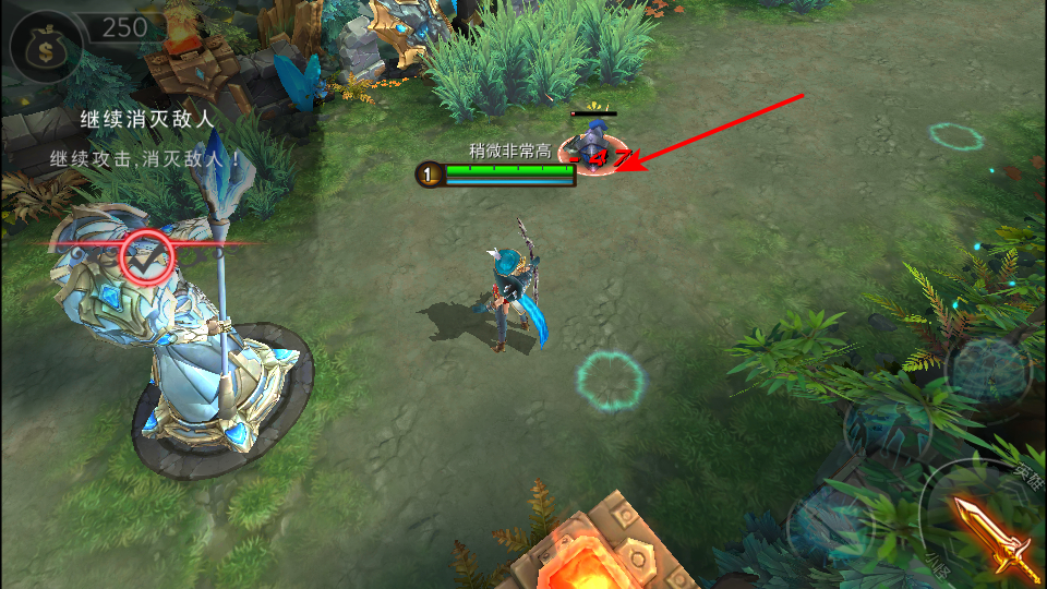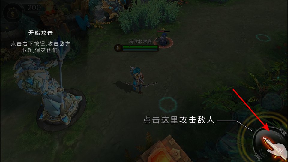 3、攻擊敵人,點(diǎn)擊右下的攻擊按鈕,對敵方小兵發(fā)起攻擊,消滅敵人以獲取經(jīng)驗(yàn)和金幣。