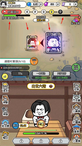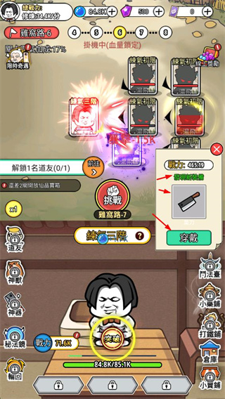 4、解鎖道友后,可參與雞窩路等挑戰(zhàn),戰(zhàn)斗中能獲得菜刀等道具,點(diǎn)擊穿戴可裝備道具,提升角色戰(zhàn)力。