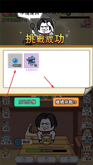 2、挑戰(zhàn)成功后,可獲得水晶、大頭貼碎片等獎(jiǎng)勵(lì),之后可選擇原地掛機(jī)或繼續(xù)挑戰(zhàn),繼續(xù)游戲進(jìn)程。
