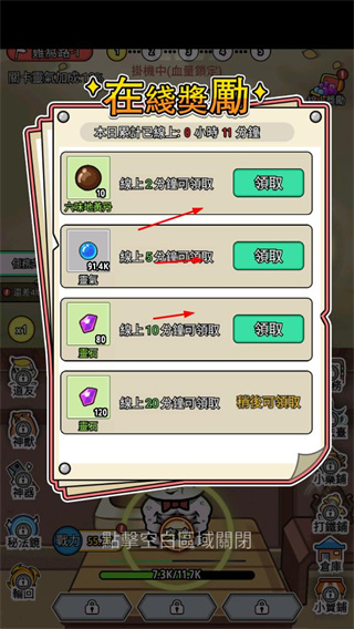 3、在在綫獎(jiǎng)勵(lì)界面,根據(jù)線上時(shí)長(zhǎng),可領(lǐng)取小精靈的淚、藍(lán)寶、紫寶等獎(jiǎng)勵(lì),助力角色成長(zhǎng)。