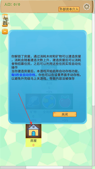 1、看到解鎖房屋提示后,了解到可消耗木材和礦物建造房屋,點(diǎn)擊關(guān)閉按鈕關(guān)閉提示框。