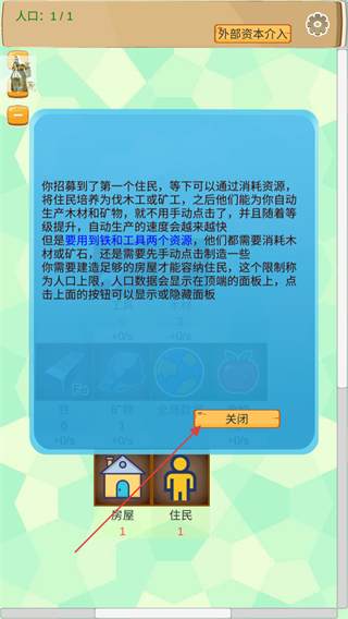 4、招募到第一個(gè)居民后,閱讀培養(yǎng)居民成為伐木工或礦工等相關(guān)說明,點(diǎn)擊關(guān)閉按鈕,后續(xù)通過消耗資源培養(yǎng)居民實(shí)現(xiàn)自動(dòng)化生產(chǎn)。