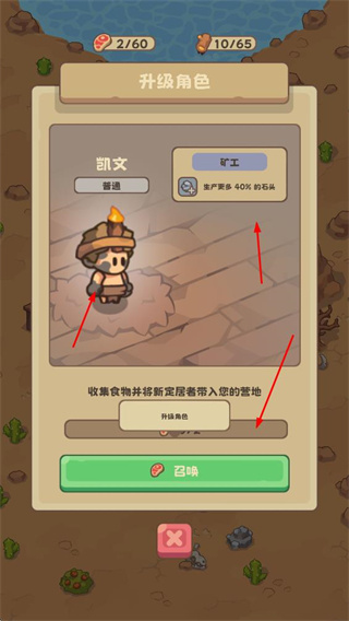 2、在升級角色界面,可對角色進(jìn)行升級,像凱文作為礦工,升級后能提升礦產(chǎn)率,助力資源獲取。