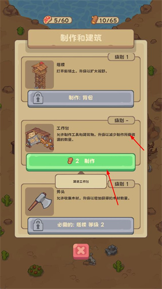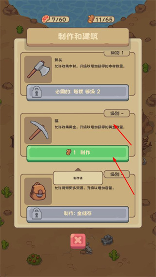 4、同樣在制作和建筑界面,能制作斧頭、鎬等工具,這些工具可提升收集木材、黃金等資源的效率。
