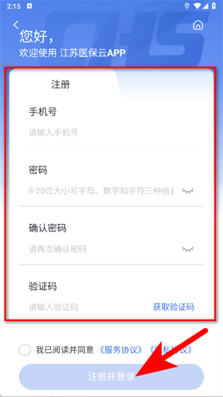 4、依次輸入手機(jī)號,獲取并輸入驗證碼等信息,勾選同意相關(guān)協(xié)議后,點擊注冊并登錄,完成注冊。