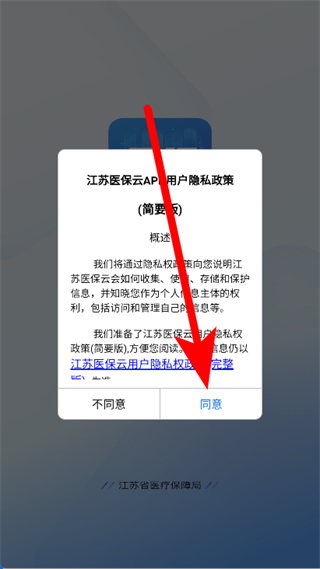 1、打開江蘇醫(yī)保云APP,在用戶隱私政策彈窗中點擊同意。