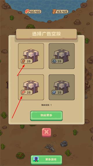 1、可選擇廣告空投獲取資源,如木材、肉類等,助力游戲進程,也能購買更多空投來獲得更多資源。