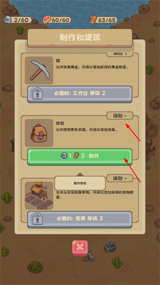 2、在制作和建筑界面,能制作背包等物品,背包可攜帶更多資源,升級還能增加容量,方便資源收集與攜帶。