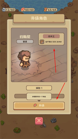 3、進入升級角色界面,可對角色進行升級,像約翰尼作為伐木工,升級后能生產(chǎn)更多木材,提升資源獲取效率。