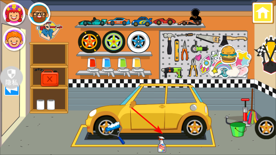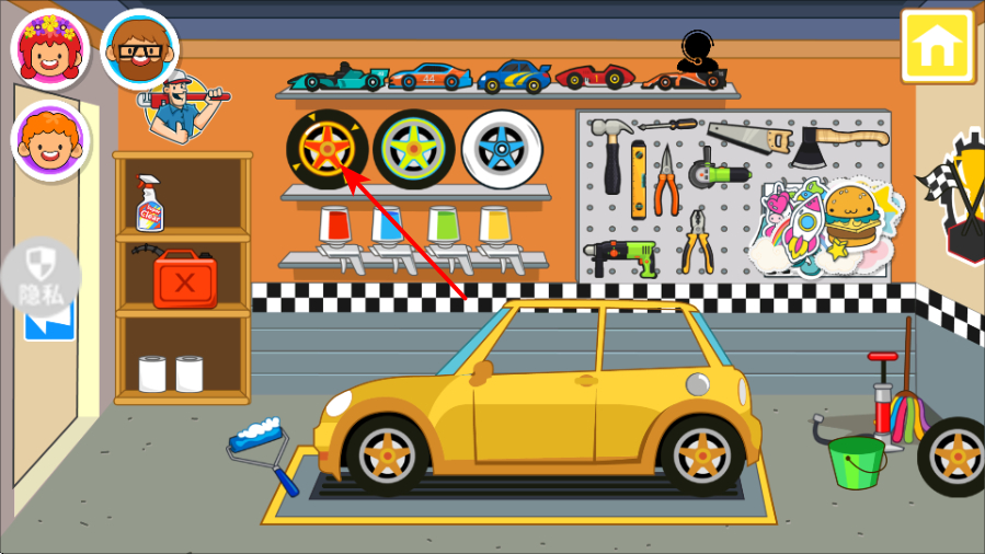2、更換汽車輪胎,在汽修場景中,點擊貨架上的輪胎,更換輪胎,完成維修任務(wù)。
