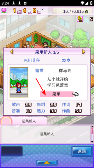 1、采用新人,點(diǎn)擊采用的按鈕,招募具有潛力的新人如冰川艾莎,為升星儲備人才。