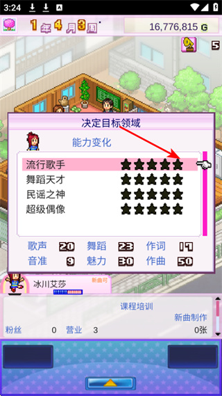 2、選擇目標(biāo)領(lǐng)域,為流行歌手等目標(biāo)領(lǐng)域,該領(lǐng)域的星級潛力將引導(dǎo)新人能力發(fā)展方向,助力升星。