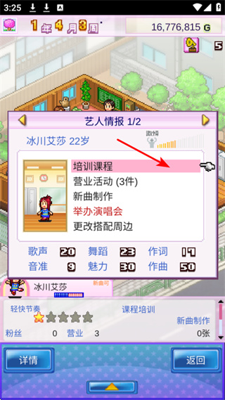 藝人成長設(shè)有清晰的階段性目標(biāo),初始階段通過常規(guī)培訓(xùn)達(dá)到首個屬性上限,可利用爆氣狀態(tài),或等待每年九月更新的高級課程,優(yōu)先購入高價(jià)課程避免資源浪費(fèi)。