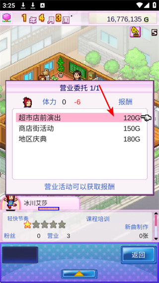 4、完成營業(yè)活動,選擇超市店前演出等營業(yè)委托,完成活動獲取報(bào)酬的同時(shí),提升新人的經(jīng)驗(yàn)和知名度。