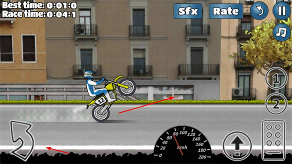 2、操控摩托車行駛,通過相關(guān)操作讓摩托車做出特技動(dòng)作,同時(shí)留意速度表,控制行駛速度,爭取好成績。